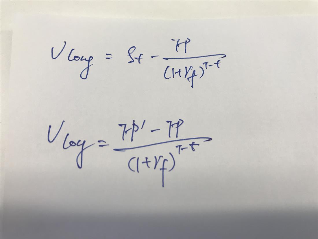 衍生品,reading39,原版书课后题第6题,问什么情况下short position亏损。这个问题其实可以转换成,什么时候long position赚钱对吧?***老师讲的思路,是根据我截图里面第一个公式,无风险利率上升的时候,V(long)赚钱,这个明白。不过纪老师教过我们一个通用公式,也就是我截图里第二个公式,从这个公式看,无风险利率上升,V(long)像是亏损的呢。希望老师帮忙理一下思路,感谢!