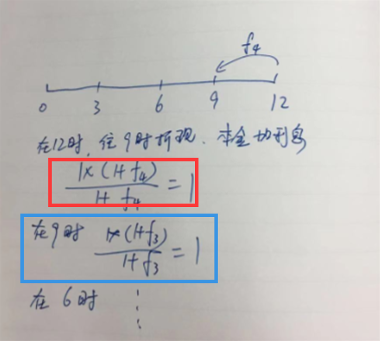已解决衍生品,reading39 定价和估值-swap-利率互换,收固支浮,老师刚才写的公式推导中,t=9时有两笔现金流:f4和par(1)没问题;t=6时没看懂,为什么只有f3和1,f4去哪里了?说是在1里面,为什么?