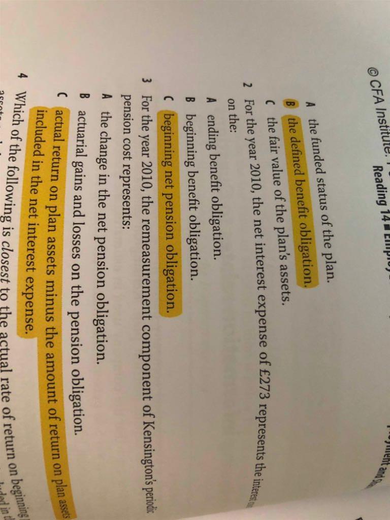 第2题,答案选C 有两点疑问,一是periodic pension cost的定义似乎与题中不同吧?二是书中哪里提到net pension obligation(即funded status)乘以利率就是net interest(income)expense? 哪里来的net interest(income)expense的概念呢?