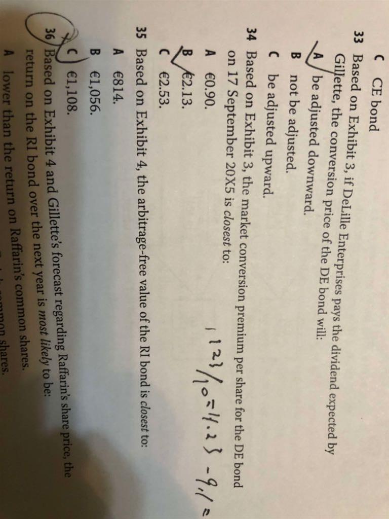 第33题,答案选B。 我有一个与题目不直接相关的问题,即如果20X5年9月17日执行转换权,将债券转为股票,可以转为多少股股票? 是否等于issue price/initial conversion price=100股? 还是等于convertible bond market price/current share price=1,123/9.1=123股?或者其他算法?