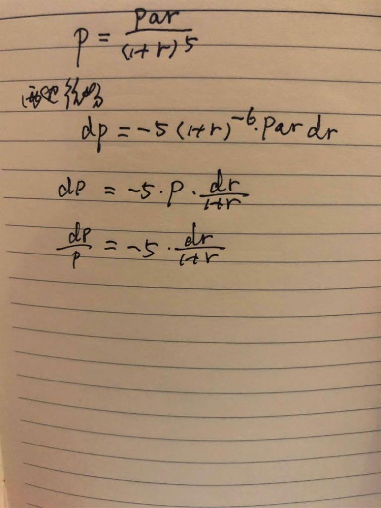 久期是价格变动对于利率变化的敏感性,5年期无息债券的久期为什么等于5?等于5意味着,1%的利率变化,会带来5%的债券价格变化?但我刚才计算了下,两边微分后,系数并不是5,还要除以(1+r),为什么?怎么解释?