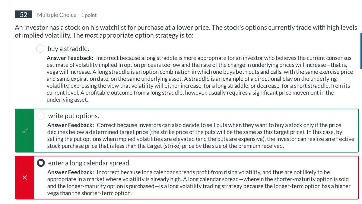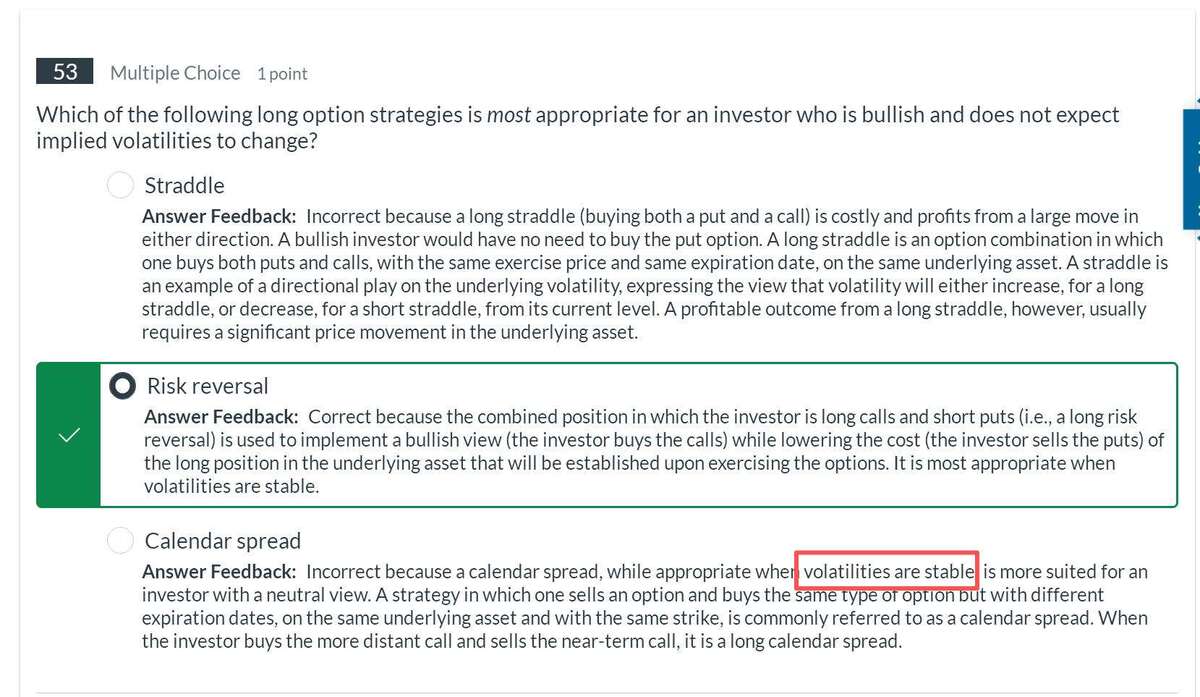 52题的说未来波动率上升的时候要long calender spread,53题的答案说calender spread更适合波动率稳定的场景,完全懵了,到底哪个说法对?52题选什么?