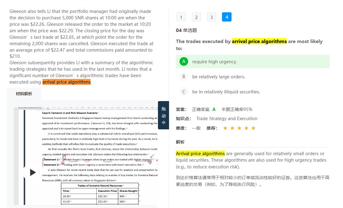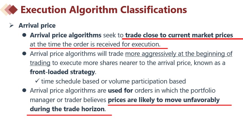 请参考以下讲义截图,利用arrival price algorithms,目的是尽快按照当天市场价格交易,预计市场价格走势让人皱眉头(想买入,但是市场价格走高;想卖出,但是市场价格走低)