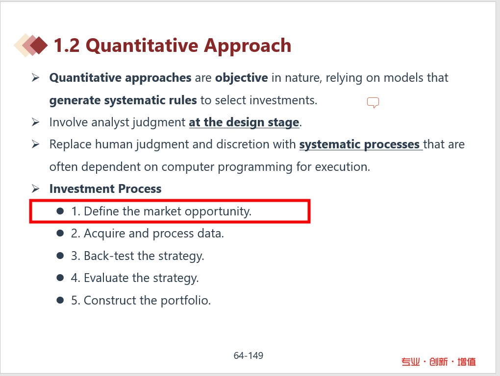 题目要求是Knight asks Nowacki: “What is the starting point for the quantitative investment process?” ,量化的第一步是Define the market opportunity.