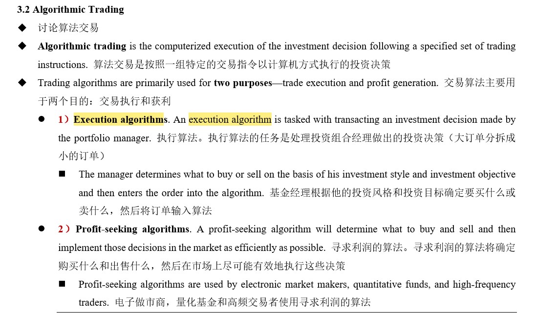 分为交易执行算法(Execution algorithms)和追求获利算法(Profit-seeking algorithms)