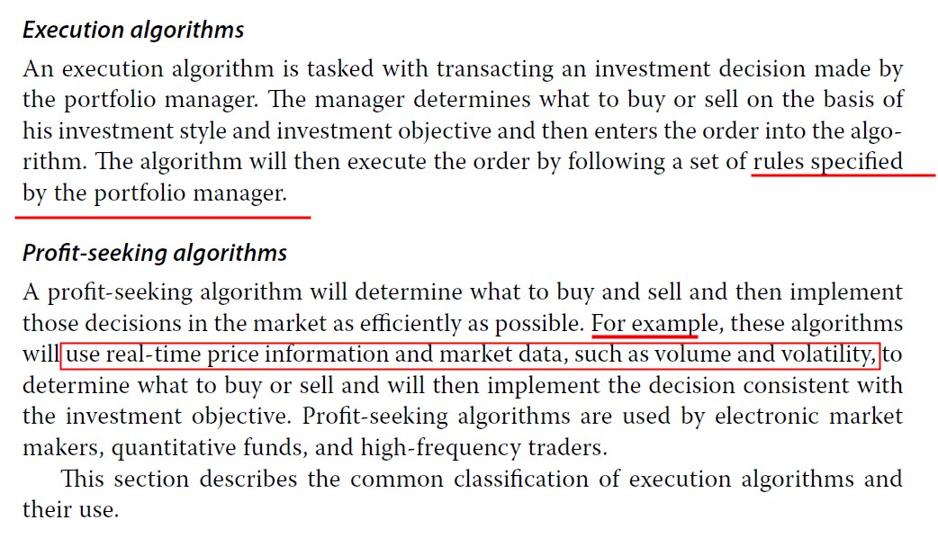 Execution algorithms是按照特定的规则执行的,强调的是执行方法,因为有很多顾虑(交易成本,信息是否会泄露等)需要考虑到