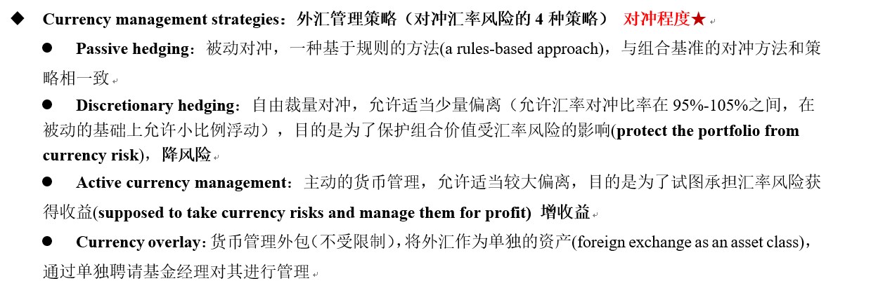 此题考查知识点见截图1。外汇市场有效的,不能获得超额收益,所以从长期来看,没有人能够在外汇市场中获得超额收益,所以不应该在外汇上对冲,这种操作只会产生更高的交易成本,从而降低组合收益。