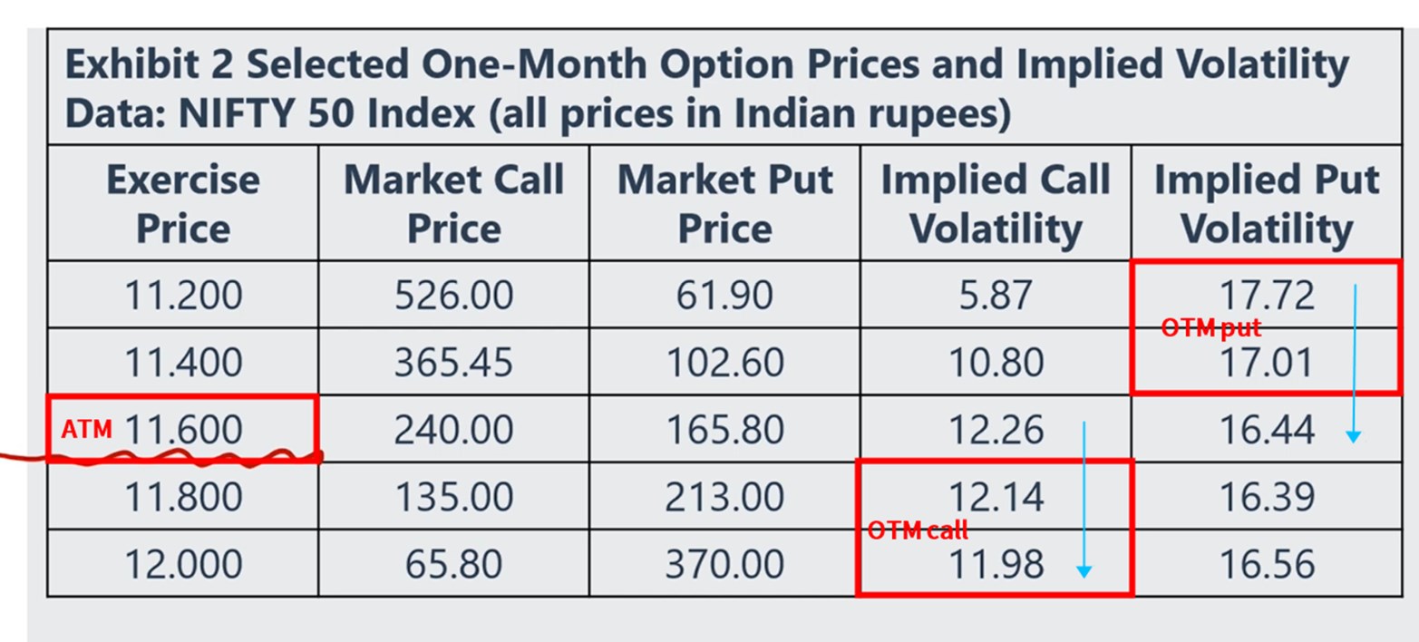此题行权价11.60是ATM(currently trading at a level of 11,610),然后根据信息可以画图,横轴是行权价,纵轴是volatility。