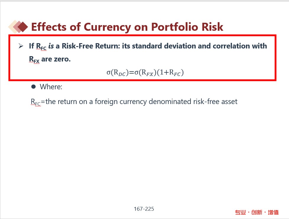 2. 因为表格里asset risk=0,所以外币资产的风险被抵销(相当于投资于外币无风险资产),那么总风险σ(R𝐷𝐶)=σ(R𝐹𝑋)× (1+R𝐹𝐶)
