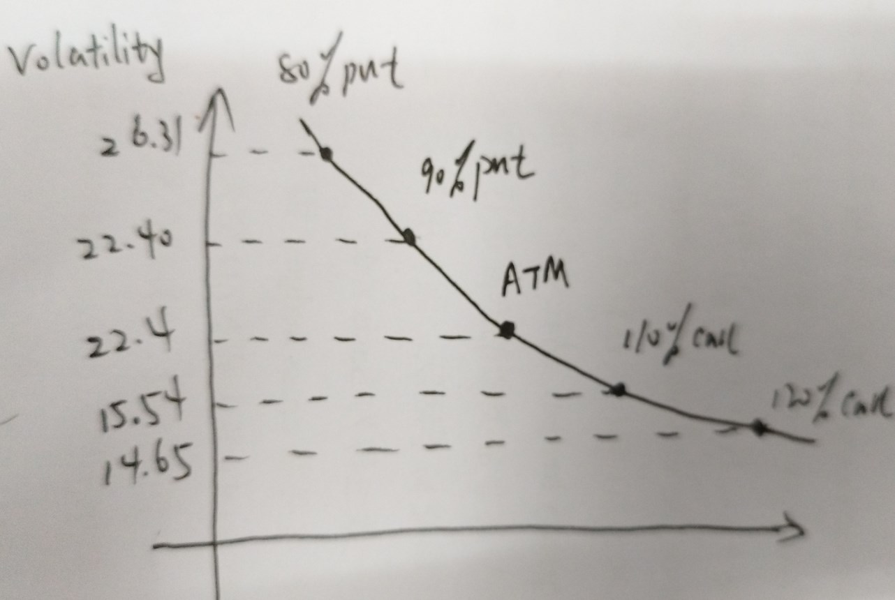 第二行是隐含波动率。所以ATM的隐含波动率是17.4,80% put的隐含波动率是26.31,画出图像是volatility skew。