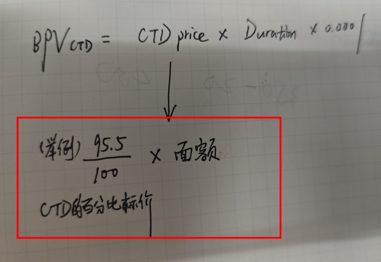 BPV CTD的计算详细见截图,衍生里是把CTD的百分比报价(例如每100面额定价95.5,然后面额是100,000)转换成1份CTD的实际价格,但这道题里,已经给了单份CTD的实际价格97,750,所以红框里的步骤是不需要的。