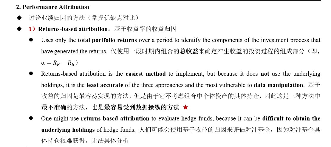 以下截图中,returns based attribution基于收益的归因,它是最容易受到数据操纵的方法【这里强调的是:基于获取的数据做出分析结果】