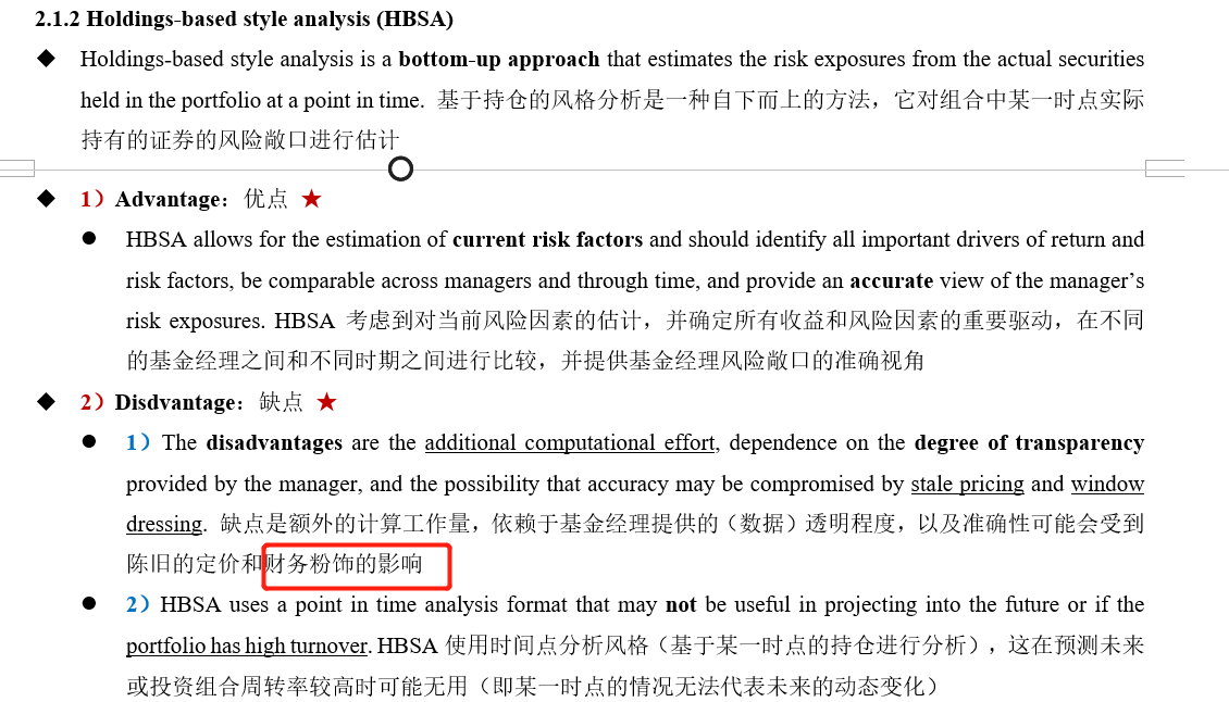 在权益和交易这两门课中,style analysis都有,确定manager投资风格,可以return 也可以holding based,此时调仓(一个时间点)可以改变holding based analysis的结果,而收益率(一段时间无法轻易更改粉饰)