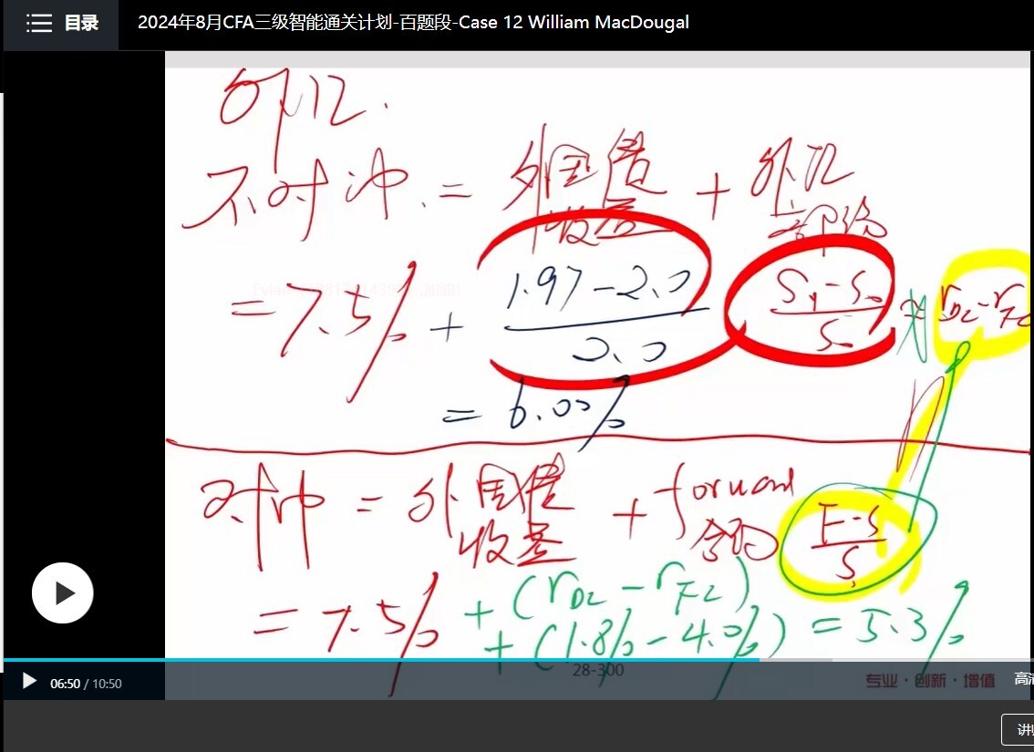 ①这道题考察了衍生品科目外汇章节的多个知识点:interest rate parity,forward premium,foreign currency return,foreign exchange return