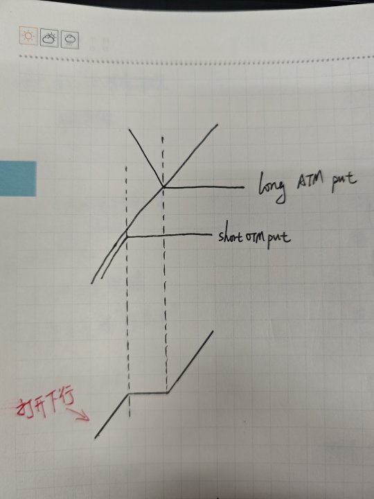 这里put spread是持有股票,担心下跌,买入put,同时降低成本,再卖出一个put。