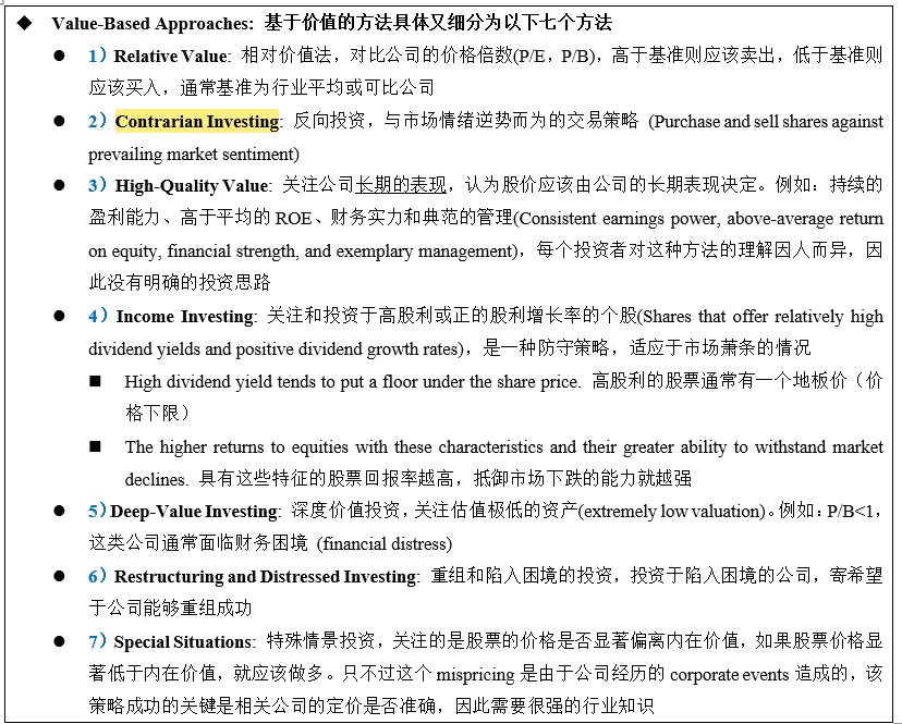 Deep-Value Investing: 深度价值投资,关注估值极低的资产(extremely low valuation)。例如:P/B<1,这类公司通常面临财务困境 (financial distress)
