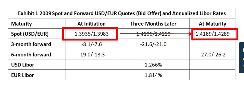 2. 6个月后到期,为了把forward平掉,我得去市场上按照spot rate 买回EUR,但这时候spot rate是1.4289,只看表格中spot rate这一行,可以看到欧元在升值,所以EUR是越来越贵的(sell low and buy more high,按照1.3916卖,1.4289买回),我买EUR不划算。所以made it even more negative。