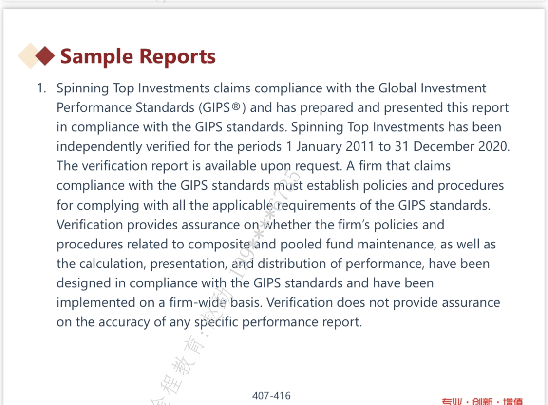 所以这类文字就要当心,一般正确的描述就是firm comply with GIPS , 要是当中出现了一堆描述,什么什么遵守了GIPS,这往往是错的,协会就是考大家知不知道全部遵守这个点。