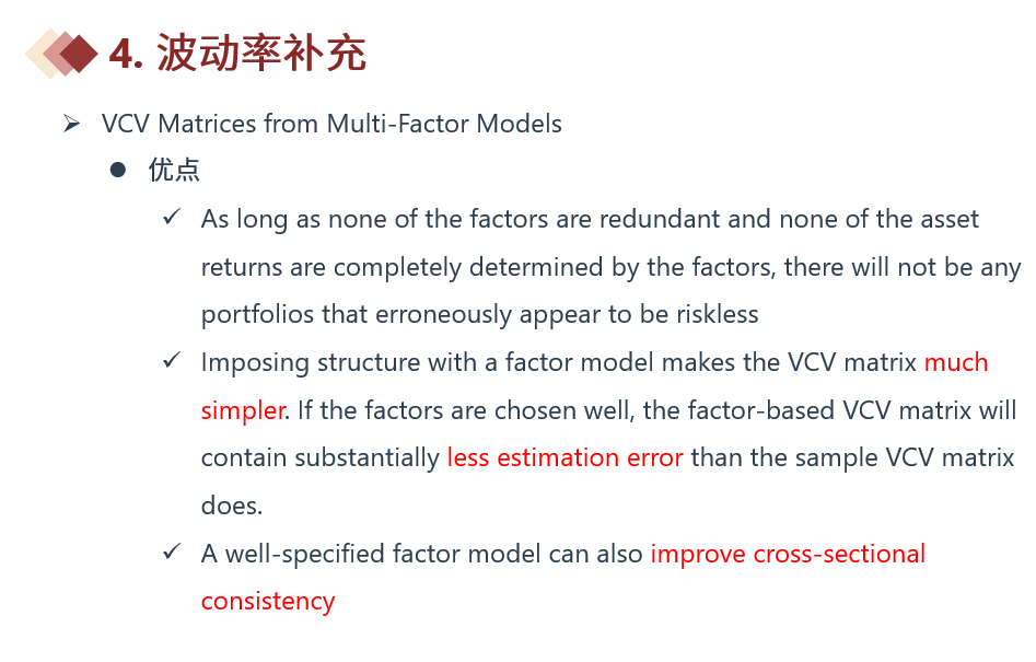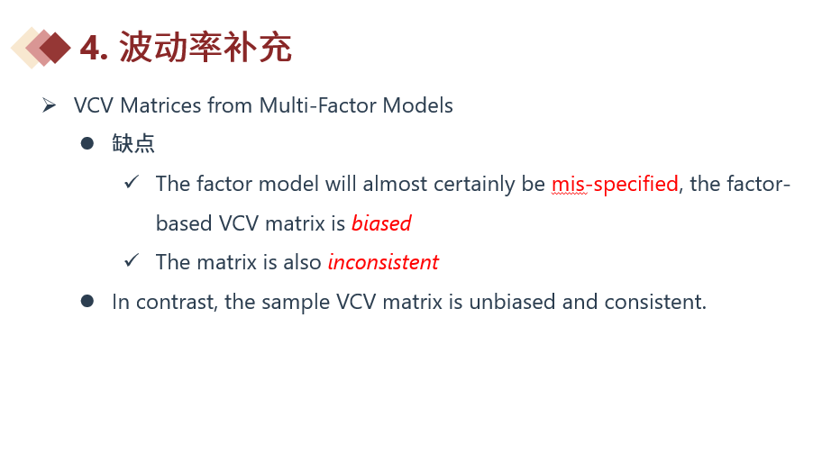 同学你好,可以参考下图,factor based VCV没有consistency,但是又cross sectional consistency,这两个是不同的概念。Consistency指的是随着样本量的上升,VCV matrix的预测精度在提升;而cross sectional consistency指的是不存在矛盾,就比如有abc三个资产,a和b的相关系数为1,b和c的相关系数也为1,那要是a和c的相关系数也是1,那么就是cross sectional consistency,但万一矩阵中显示a和c的相关系数不为1,那就不满足cross sectional consistency,存在矛盾