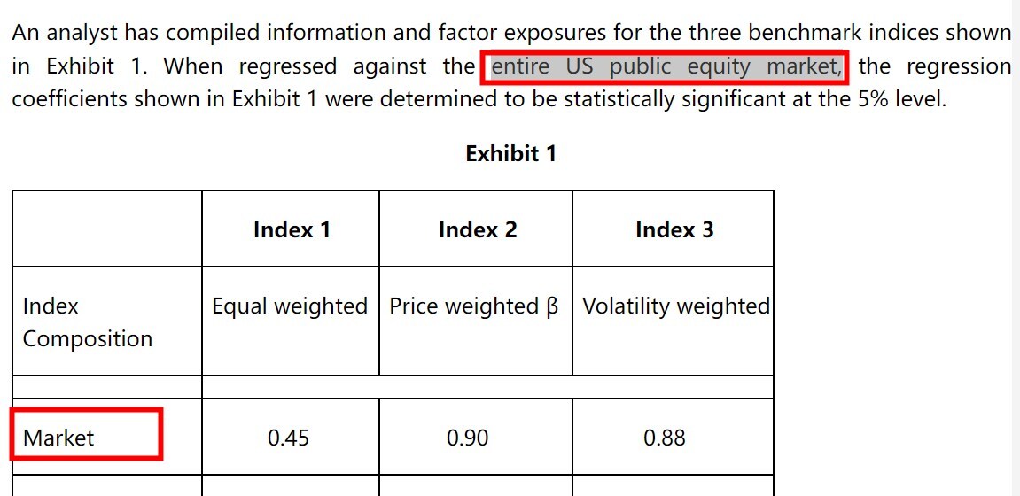 老师 他这个题干用whole public equity回归的意义是什么 在第二题risk diversification的选择 我看index 2 和market有最高系数 我以为这样unsystematic risk最小