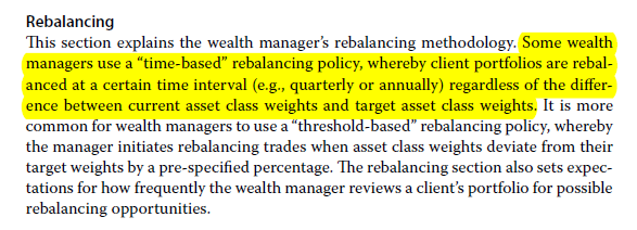 同学你好,SAA是IPS所设定的符合投资者情况的投资组合,而rebalance是对投资组合中的资产权重进行调整,将其调回到SAA所规定的权重。Time-based是定期rebalance一次,比如每季度或者每个月一次,哪怕在这个期间内,资产的权重超出了SAA所设定的上下限也不会把它调回去,只有等到特定的时间节点了才会调整回SAA所设定的权重。而Threshold based是反过来的,只要资产权重超过了range就把他调回去,不看时间节点的。