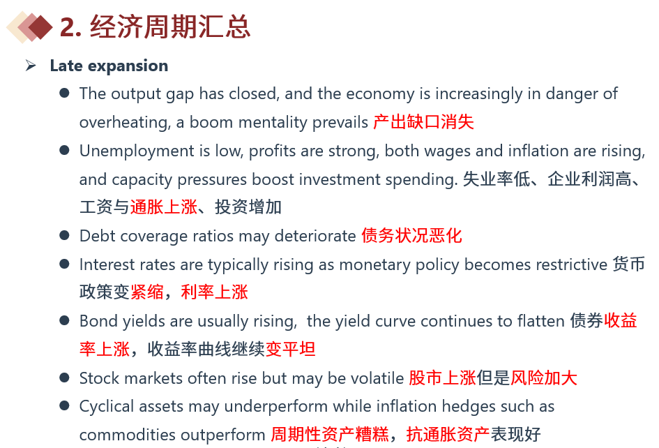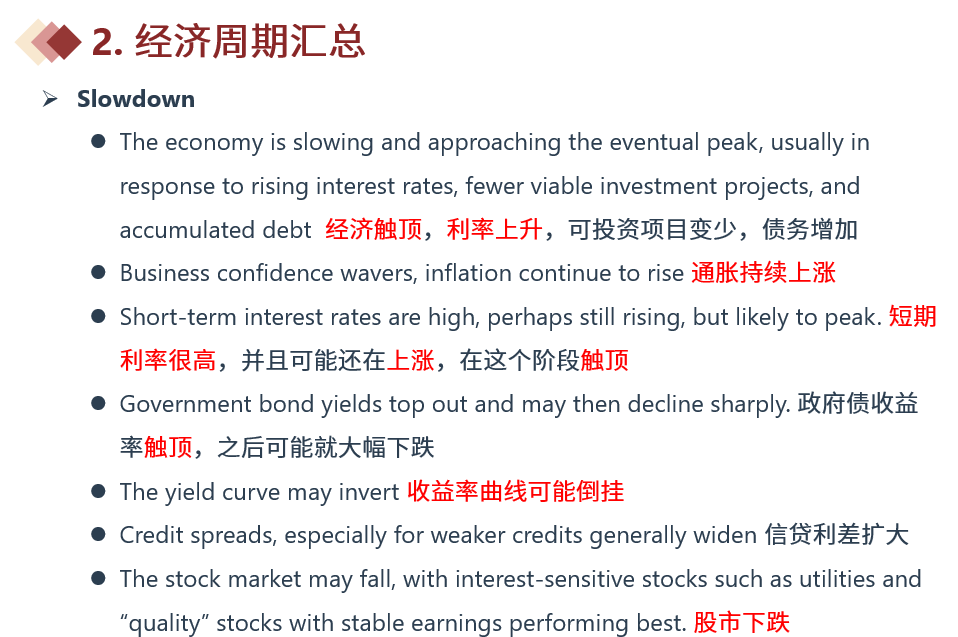 同学你好,late expansion和slow down的具体差别如下图。Slowdown的关键词是peak,经济总量要peak,短期利率也要peak,bond yield要invert