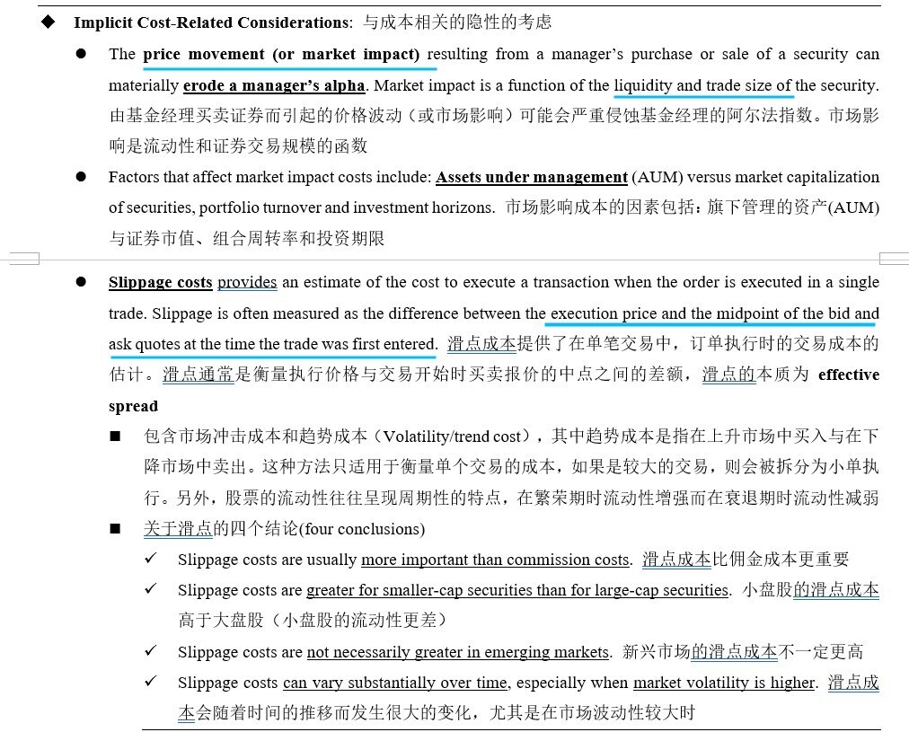 这个题目说的是implicit cost隐性成本,它本质是市场流动性和交易订单大小,市场流动性对应bid ask spread和market liquidity,订单大小对应market impact