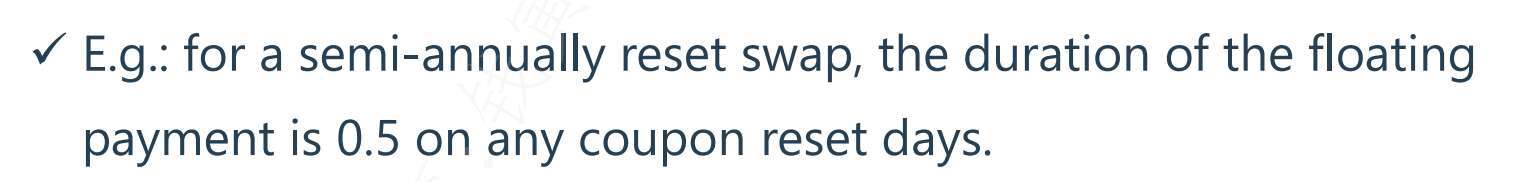 老师 floating rate swap 的duration 是多少?讲义上0.5 for semi. annual reset swap 但是我记得百题有一道是说0.25