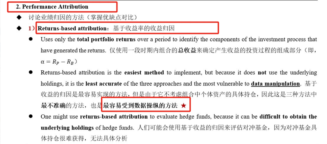 以冲刺笔记的截图中,红色框说明,returns based attribution基于收益的归因,它是最容易受到数据操纵的业绩归因方法【这里强调的是:基于获取的数据做出分析结果】