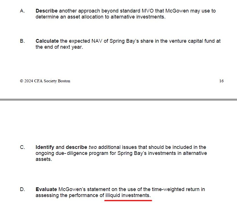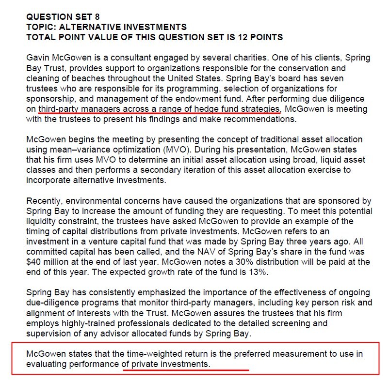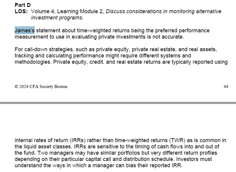 Evaluate McGowen’s statement on the use of the time-weighted return in assessing the performance of illiquid investments. mock2下午卷8.4,这题不可以用MWRR 吗,MWRR 和IRR的区别是什么