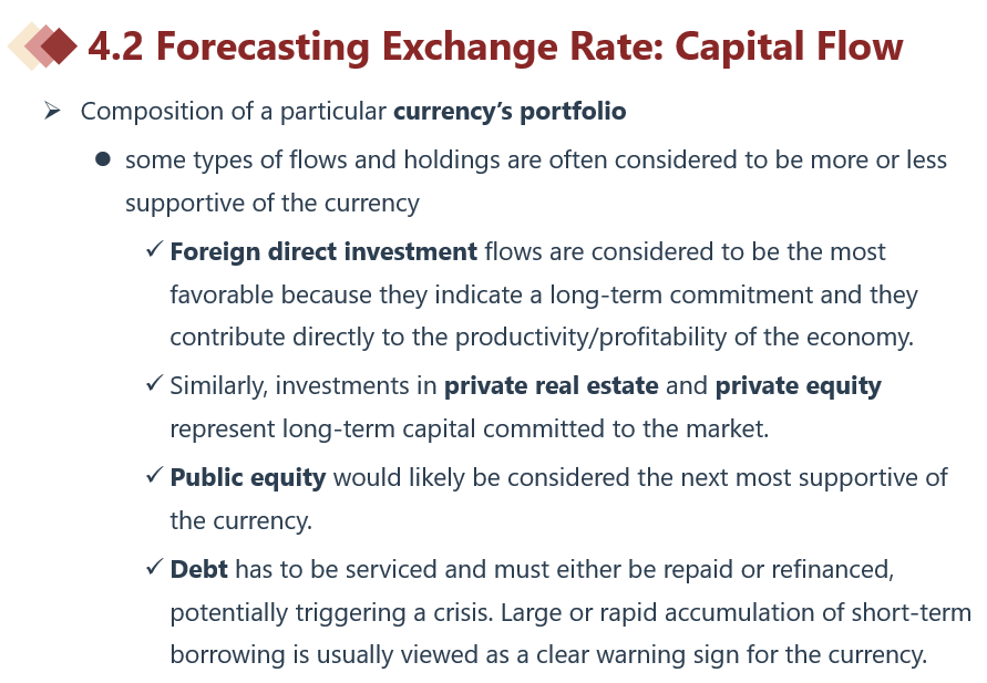同学你好,currency portfolio就是外资在某一国的投资组合,在所有外资投资中,FDI对于被投资国是最有利的,而债务形式的投资对于被投资国是风险,尤其是短期外债,万一汇率发生不利变动的话就会导致偿债风险进一步加剧,可能发生违约风险