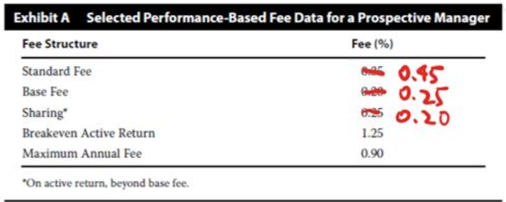 同学你好,这题我觉得是有问题的,数字应该没有编好。standard fee是当active return = breakeven active return=1.25%时的总费率(base fee+sharing fee),但这里算出来是不等的。而且他说在breakeven return的时候没有sharing fee也是有问题的,如果没有sharing fee, 那么standard fee应该和base fee一样。