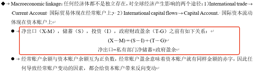 理由见截图。(X − M) = (S − I) + (T − G)净出口=私有部门净储蓄+政府盈余,通俗理解就是,国内有盈余,才会对外出口。