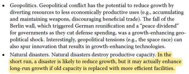 选A,金融危机。像是自然灾难,可以淘汰落后产能。而政治冲突,也能激发创新,提高生产力,如太空竞赛。