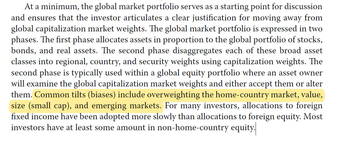 这是原版书上的一个结论:常见的配置偏好包括超配本国市场、价值股、小盘股以及新兴市场。就是一个实际观察到的现象。