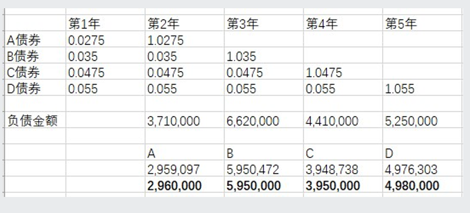 不需要,实际计算没这么复杂,就是根据现金流,coupon + 本金,同一年份,不同债券的现金流加总,然后列等式,计算出面额后,再根据题目要求四舍五入。具体见截图。