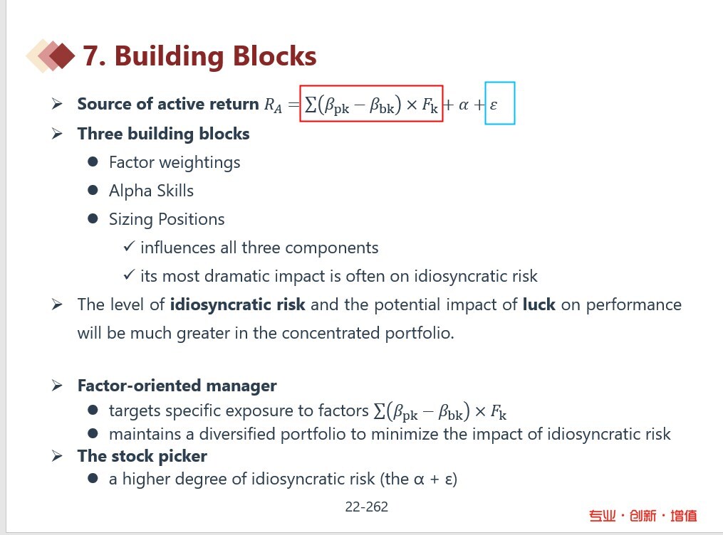 反应基金经理的个人能力的是截图公式中的alpha。随机因素(类似于运气)是 ε 。