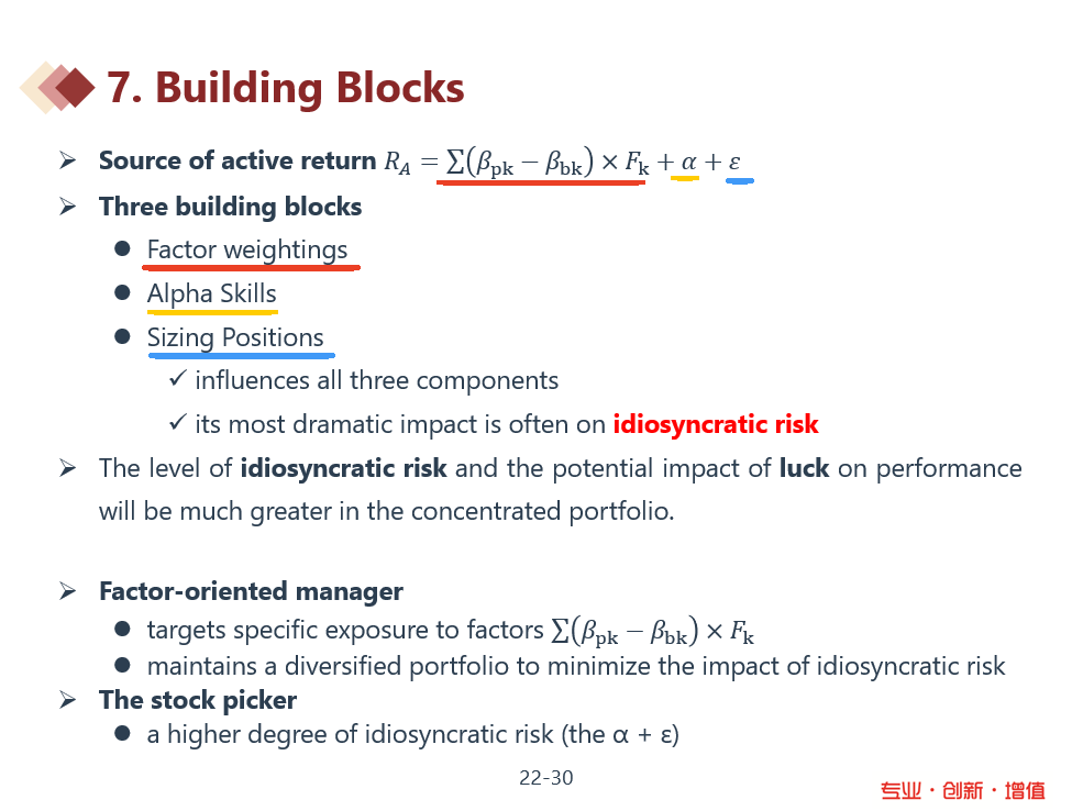 The three main building blocks of portfolio construction are alpha skills, position sizing, and rewarded factor weightings. 这里的position sizing 和 rewarded factor weightings分别是啥意思?
