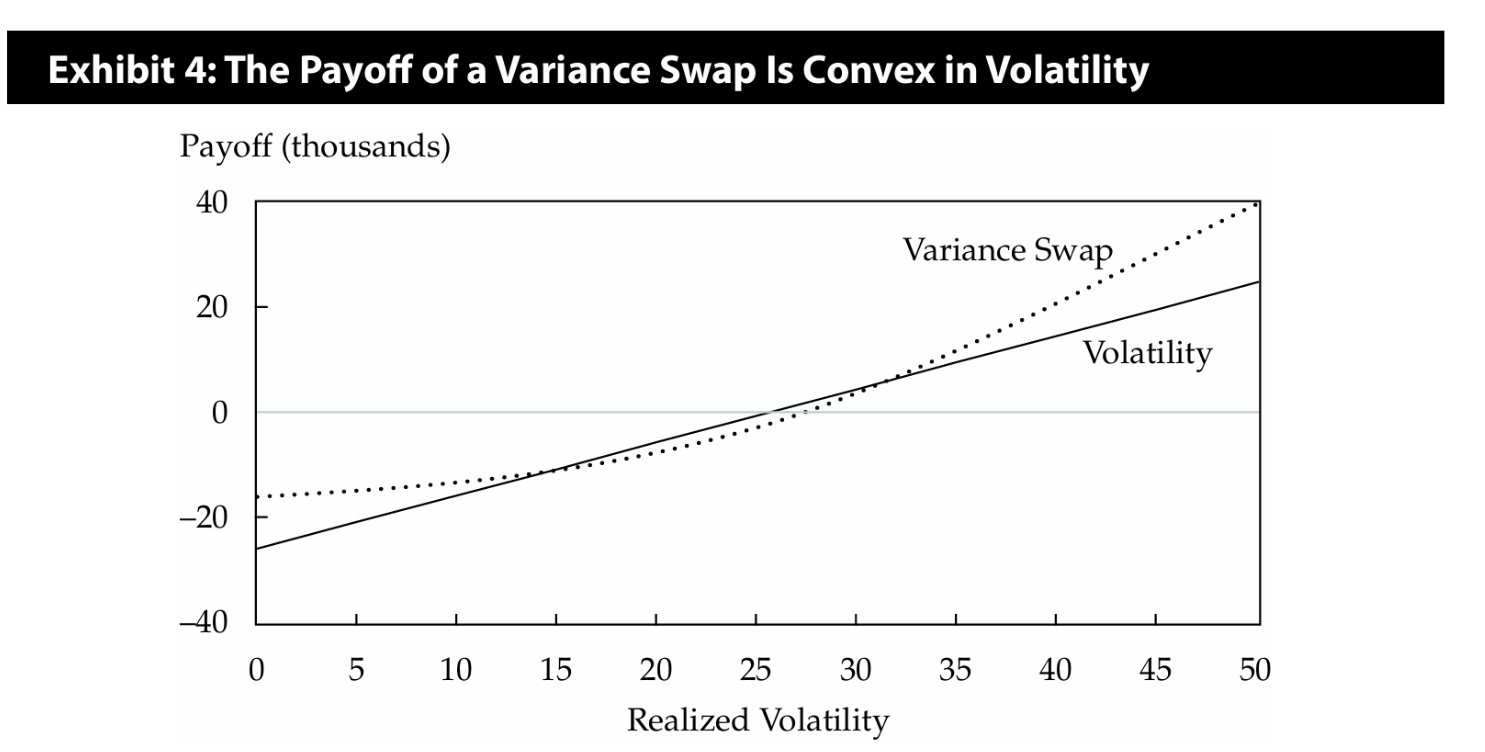 因为方差互换的收益具有凸性,这使它成为一个非常有吸引力的产品。投资者(买方)为了获得这种凸性,愿意支付比用一篮子平价期权“自己动手”复制一个类似头寸更高的价格。因此,卖方就能以这个“更高的价格”卖出。