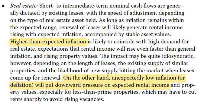 冲刺笔记上说,real estates在Above or below expectation:房地产有良好的抗通胀效果,当通胀超出预期时说明房地产需求高,人们会预期租金收入的增幅高于通胀,房地产价值也会上涨; 但是这里为什么说falling inflation不是很好?