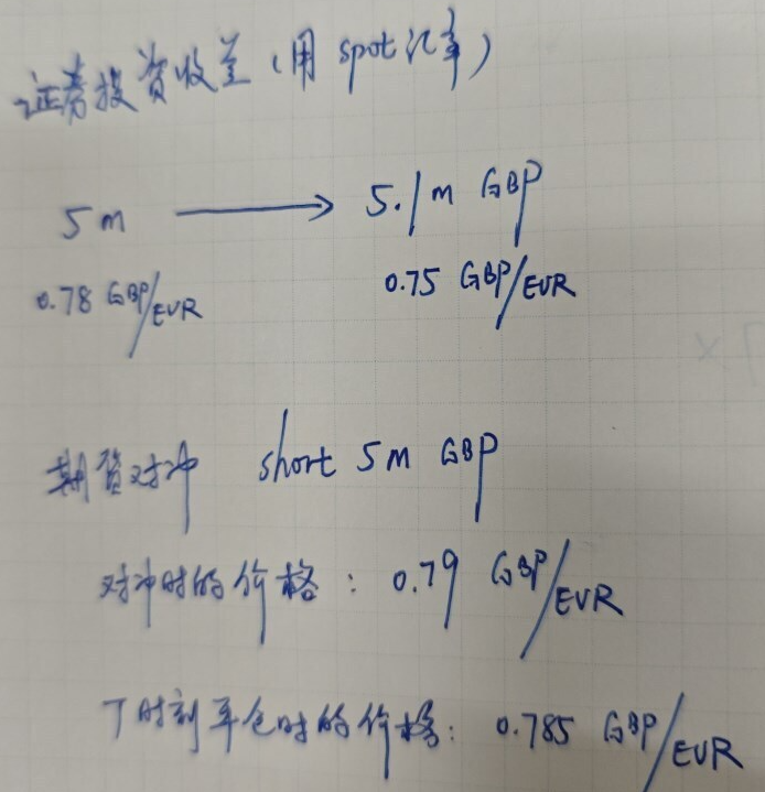 2. 然后是short GBP futures,合约金额5m GBP,报价0.79GBP/EUR,然后投资到期时,同一到期日的futures报价0.785 GBP/EUR(futures还没到期,题目里,投资期是180天,期货合约是270天),那么futures盈亏=5/0.79-5/0.785=-0.040313