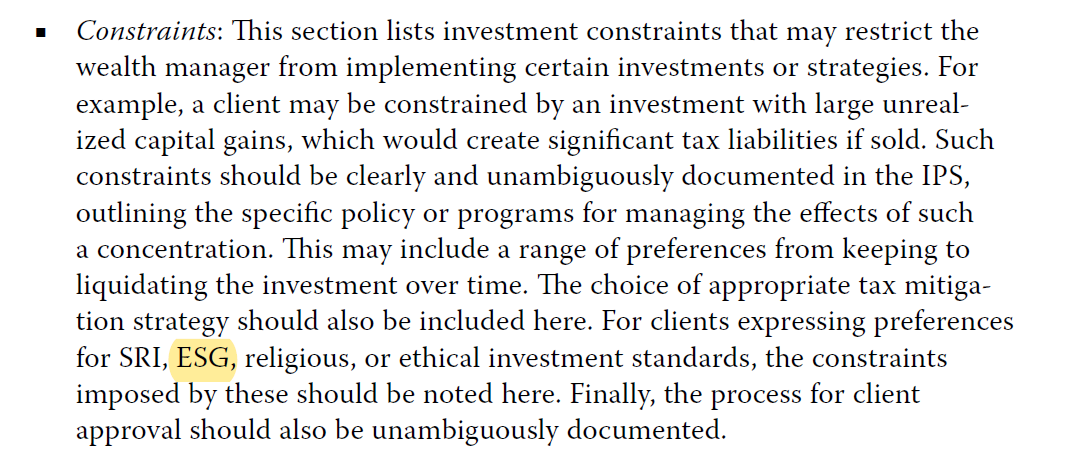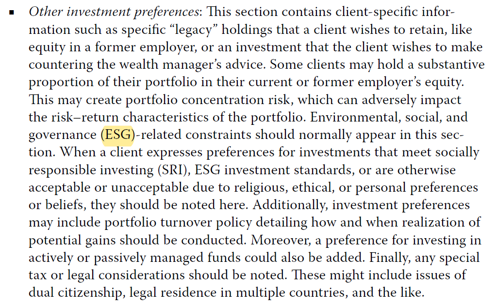 这道题选A,课后题答案错的。Other investment preferences和constrain里,都可以有ESG。