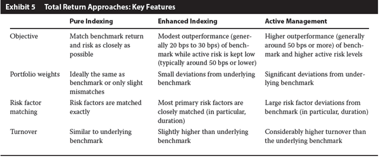 Enhanced Indexing:enhanced indexing allows small deviations in portfolio holdings from the benchmark index but tracks the benchmark’s primary risk factor exposures very closely (particularly duration).