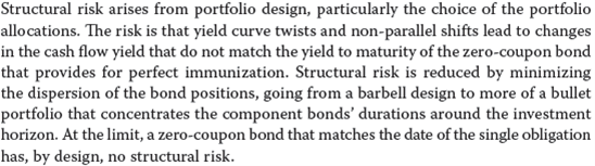 为收益率曲线非平行移动导致免疫策略失效的风险也称为Structural risk (The risk arise because yield curve twists and non-parallel shifts)。最小化债券头寸的离散程度(或凸性)来降低结构化风险,即现金流的离散程度越小,非平行移动的风险就越小。