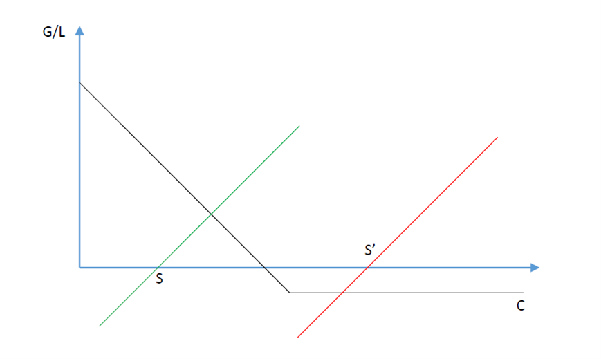 如下图,纵轴表示的是gain or loss。期权如图所示。股票的G/L取决于买入的价格,如果以S买入,那就是图中的绿线。如果以S´买入,那就是图中的红线。