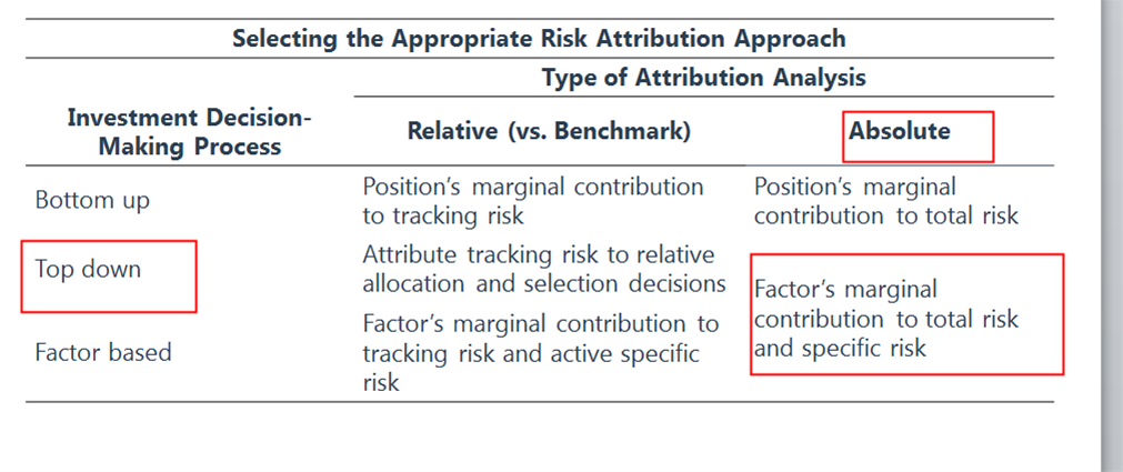 同学你好,根据如何选择合适的risk attribution的方法,我们可以知道如果基金经理是top -down和absolute return的,那么就应该选择Factor’s marginal contribution to total risk and specific risk这种方法。