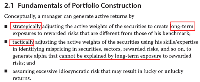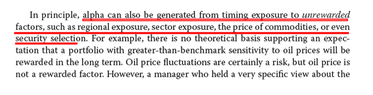 也就是说那个公式里的α包含的内容非常杂, 可能既有选择unrewared factors的能力, 又有选股能力, 就是但凡不被第一个求和项解释的内容, 都归在α里; 另外, 第一个求和项(即factor weighting)的部分, 仅包括rewarded factors, 其余一律不包括, 并且这一项里的factors仅在长期上进行调整(可能由于CME变化等因素导致). 您看我这个理解是否正确?