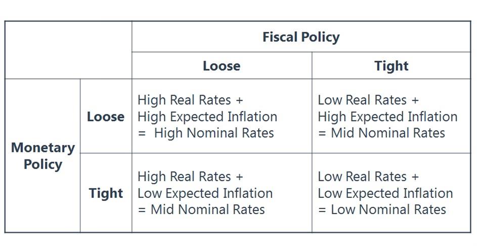 同学你好,我们需要区分的是名义利率和实际利率,财政政策紧缩会导致实际利率下降,但是宽松的货币政策又会导致预期通胀上升,这两者一结合,对名义利率(实际利率+通胀)的影响就不好说了,有可能推升有可能降低,但通常会导致一个中等的名义利率。其他的货币政策和财政政策结合起来的效果见图。