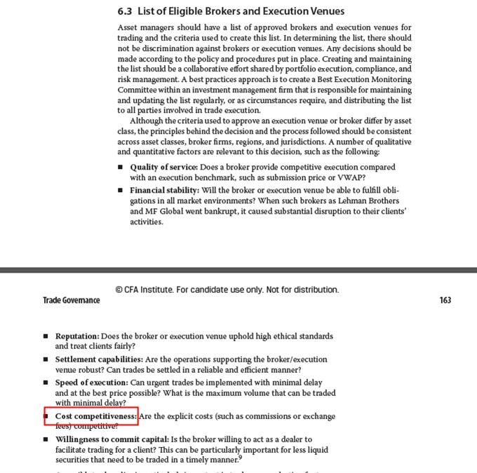 那如果是这样的话, 这一条陈述错误的原因就应该是, 如果仅以trading cost筛选trader的话, 那么结果未必是best execution的, 因为可能佣金低是因为trader水平不行, 因此反而会造成更多的机会成本, 导致没有达到best execution. 这个理解是正确的吧? 视频中老师这里讲得不是很透彻, 当时我也不确定这个trading cost的理解是否正确, 所以我来请教一下老师.