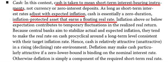 同学你好,原版书也说了,这里讨论的cash不是说货比现金(不会产生任何利息的那种),而是一种期限很短而且有利息收入的工具,你可以想象一下就是货币基金里面买的那些资产。这种现金等价物呢它基本上可以看做零久期,而且获得的利息呢会根据通胀调整,通胀越高利息越高,所以是inflation-protected的。
